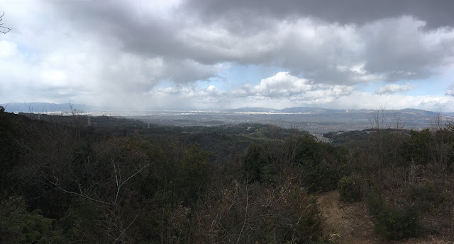 急に晴れてきたせいもあってこの神社前からの展望は最高に綺麗だった. 地元の小さな里山をただ登って楽しむだけのつもりが思わぬご褒美. ここからは京田辺の町が一望できる.うん,山城を建てるならここがいいな.